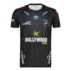 The Sharks Home jersey for the 2024/2025 season features a bold and dynamic design that embodies the spirit of the team. The primary colour remains the traditional black, accentuated by a striking pattern throughout.