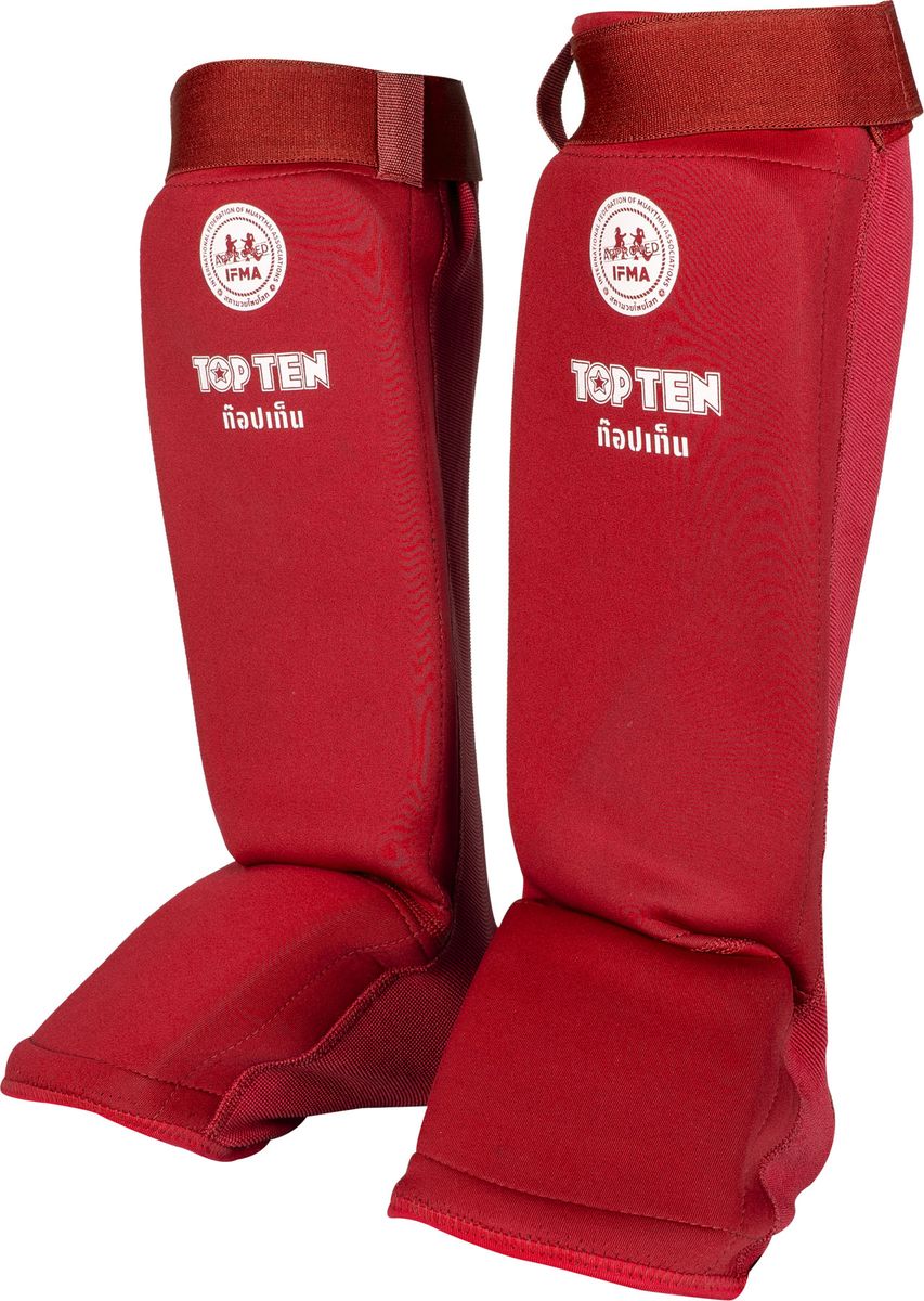The IFMA approved shin guards “Dae” from Top Ten shin guards are easy to put on and feature a snug fit close to the skin thanks to the elastic fabric. The padding over the shinbone and instep convinces with first class damping properties and is sewn to the inside of the neoprene material in a non-slip manner. All this makes the insteps “Dae” extremely comfortable to wear without compromising on safety in the sport. The shin and instep guards are rigidly connected but can be adjusted to your foot shape thanks to the elastic neoprene material.