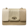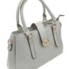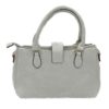 – Triple-compartment tote handbag with adjustable, removable crossbody strap.