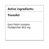 TransAct. Flurbiprofen 40 mg per patch. 28/3.1/0268. Reckitt Benckiser Pharmaceuticals (Pty) Ltd. For further information refer to the leaflet approved by the medicines regulatory authority. Consumer Care Line 0861 11 11 00. Material Ref. No.
