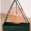 Triangle shaped iron mosquito coil holder with fireproof ashtray base and hanging chain.