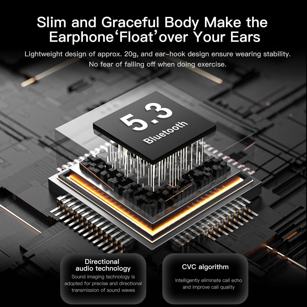 Lightweight & Ultra Comfort — Unique ergonomic groove design on the open ear headphones cavity, ultra lightweight of only 160g. Fit your ears firmly and securely, taking into account both comfort and safety, providing a breathable, open wearing experience to meet the needs to wear in sport activities. In addition, it can pick up your voice exactly and block the noise from the surroundings in calling mode, significantly improves communication efficiency.