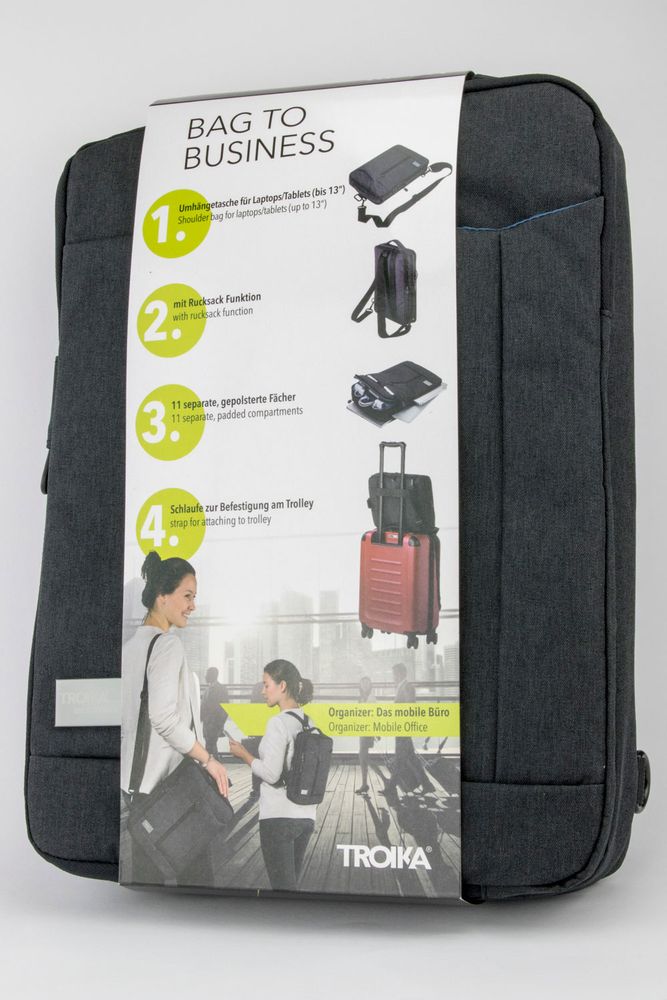 Troika Bag To Business can quickly be converted from a shoulder bag to a backpack and includes a strap for attaching the bag to your trolley suitcase.