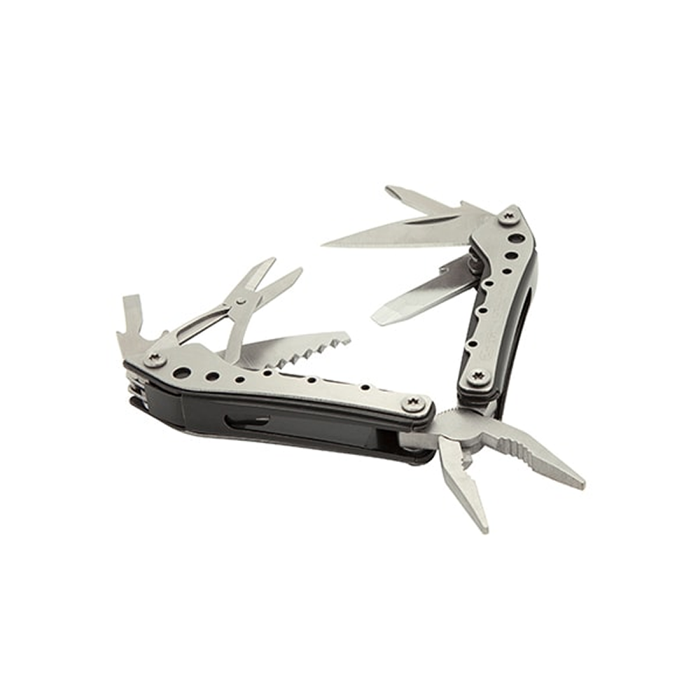 Features of the tool are: Large Flat Screwdriver; Medium Flat Screwdriver; Phillips Screwdriver; Scissors; Saw Blade; Bottle Opener; Non Locking Knife (UK legal carry); File; Pliers; Wire Cutters;