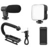 – It has a U-shaped handheld bracket, a mini LED video light, a microphone, a phone holder, and a remote shutter, suitable for smartphone/ camera vlogging, and video recording.