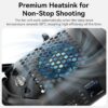 With dual power options, use a V-mount battery for outdoor mobility or a DC power adapter for stable indoor use. Adjust the color temperature steplessly from 2700K to 6500K (CRI 95) and dim from 0% to 100%. The premium heatsink ensures continuous shooting, with an automatic fan and mute mode for quiet operation.