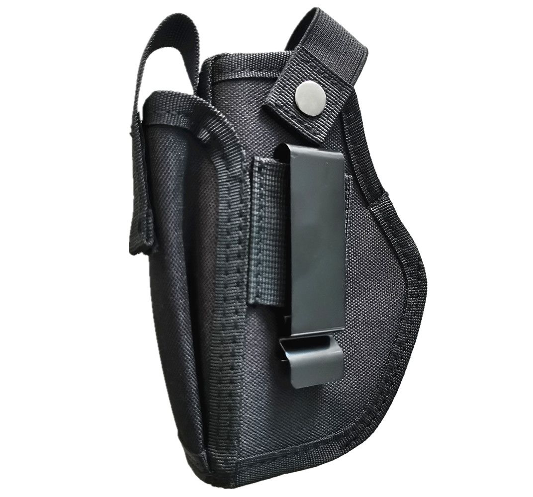 This gun holster features a 2.15-inch metal clip that can be installed to any 2-inch wide belt. An extra bag, can be used for a extra magazine or a folding knife.
