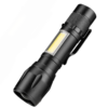 The torch is a zoomable flashlight with XPE and COB LEDs that offers 3 light modes: XPE high light, XPE flash, and COB high light.