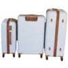 Each suitcase features a ribbed exterior, enhancing both the aesthetic appeal and the structural integrity. The sleek white body is complemented by elegant brown accents on the handles, zippers, and spinner wheels, giving the set a timeless, sophisticated look.