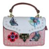 Women’s handbag, pink handbag, white handbag, embroidered bag, butterfly handbag, floral handbag, crossbody bag, top handle bag, studded handbag, gold hardware bag, structured handbag, feminine handbag, leather-like bag, compact handbag, everyday handbag, modern vintage handbag, spring handbag, summer handbag, adjustable strap handbag, leather handbag, textured leather bag, fashion handbag, tropical design handbag, palm leaf design, whimsical handbag, floral motifs handbag, luxury handbag, casual handbag, trendy handbag, gold push-lock handbag, designer handbag.