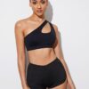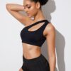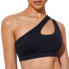 – One Shoulder Design Sports Bra : Sexy Hollow Out Yoga Bra Crop Top. The strap is on the LEFT shoulder. Super cute one shoulder sports bra. Features removable pads, elastic fabric and unique design to provide medium support and comfort while allowing maximum body movement.
