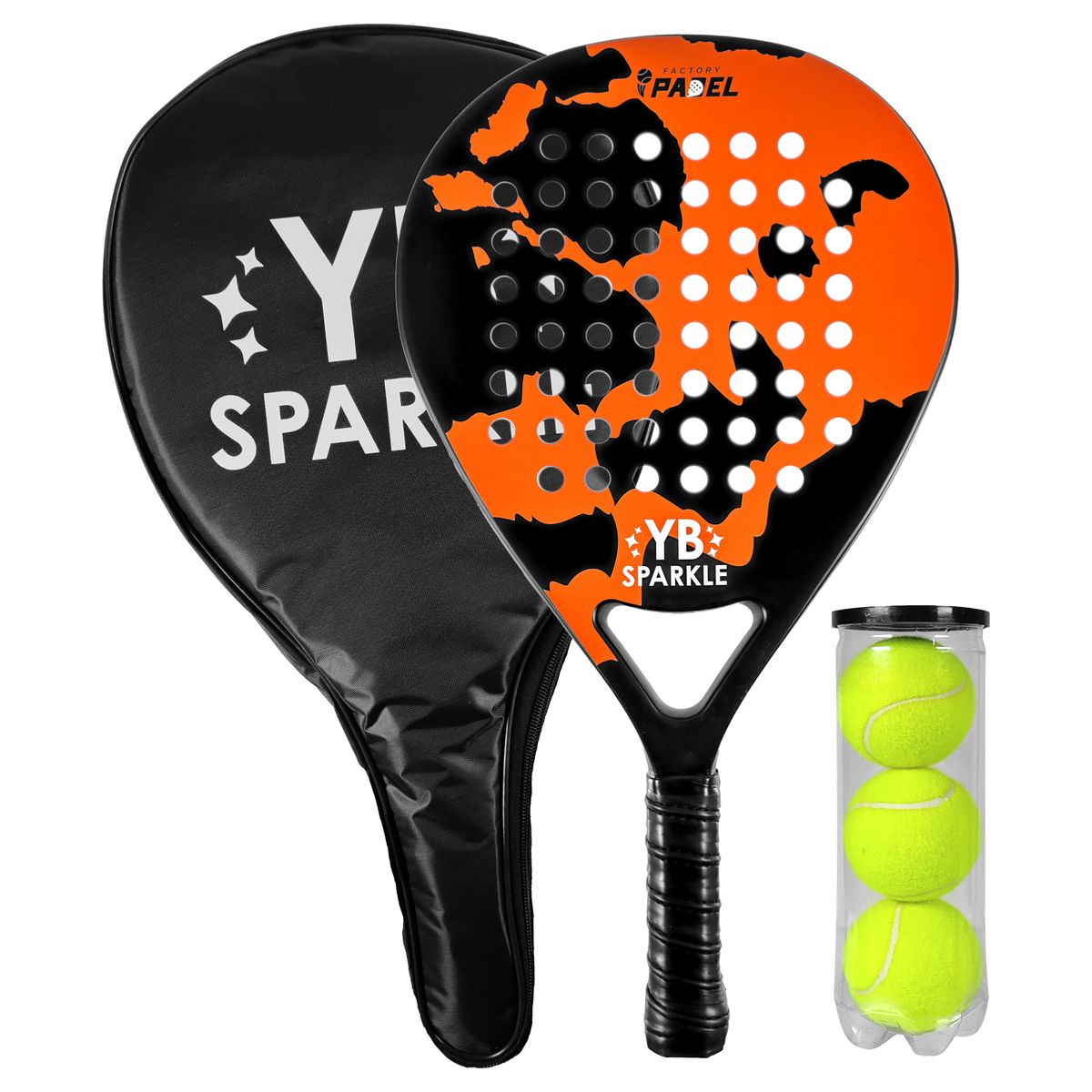 Elevate your game with the YB Sparkle Professional Carbon Padel Racket, designed for the discerning player who values performance and style. Available in three striking color combinations-blue and black, grey and black, and orange and black-this racket offers a perfect blend of durability and power with its 38mm thickness and weight of 365g ( 10g). Crafted entirely from 100% carbon, it ensures superior strength and responsiveness, providing a competitive edge on the court.