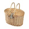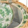 Natural wicker round basket with strong weaving pattern. Foil cooler lining on the cooler inside and a contemporary botanical fabric lining in the lid of the basket. Includes 4 white melamine plates, 4 plastic wine glasses, 4 knives and forks and spoons, 1 corksrew, and salt and pepper shaker. Cutlery and crockery strapped with leather-look straps.