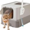 - Easy Cleaning: The litter box includes a pull-out drawer and a built-in scoop, making it easy to access for cleaning. Simply slide out the tray to change or clean the litter and hang the scoop conveniently on the lid when not in use.