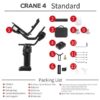 Includes: Crane 4 Gimbal Stabilizer, Tripod, Lens Support, Camera Backing Base, Dual-layer Quick Release Plate, Reflector, Screws, Camera Cables, Storage Bag
