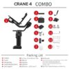 Combo includes: Crane 4 Gimbal Stabilizer, Tripod, Lens Support, Camera Backing Base, Dual-layer Quick Release Plate, Sling Grip, Wrist Rest, Reflector, Screws, Camera Cables, Storage Bag